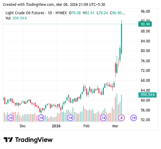 一番動いているのは、当然だが原油価格である。イランがホルムズ海峡を事実上封鎖しているため、イランのみならずホルムズ海峡を通過するほぼすべての貿易が停止しており、原油価格が高騰している。